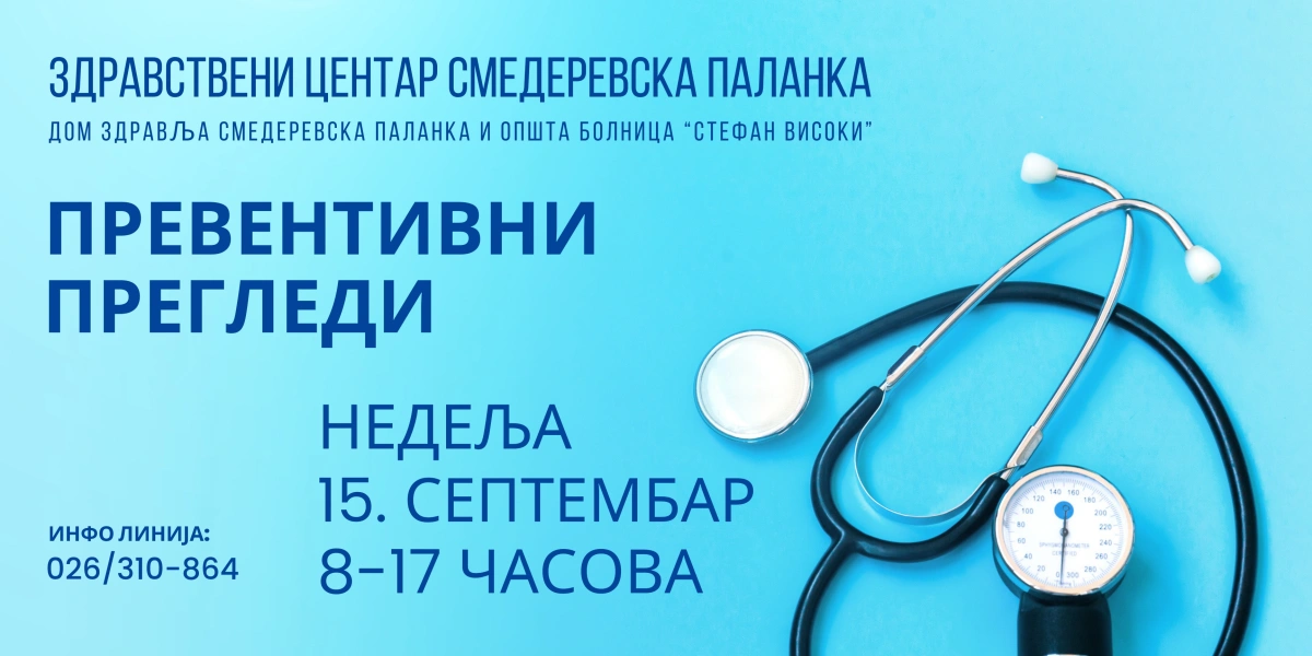 Akcija besplatnih preventivnih pregleda, koja se sprovodi u cilju rane dijagnostike i promocije prevencije bolesti, biće nastavljena u nedelju, 15. septembra 2024. godine, u većini zdravstvenih ustanova u Srbiji, među kojima je i Zdravstveni centar Smederevska Palanka (Opšta bolnica Stefan Visoki i Dom zdravlja Smed. Palanka). Zainteresovani građani će moći da se pregledaju bez uputa i bez zdravstvene knjižice.