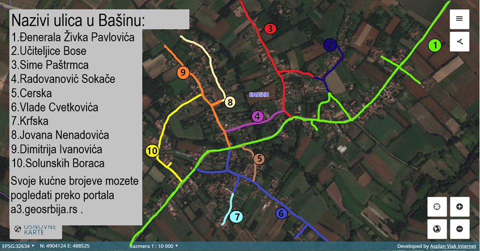 Selo Bašin odnedavno je uvelo nazive ulica u selu, parcele uredno označene i zvanično ucrtane u katastarski online registar, kao i podatak tačnog broja na kome se nalazi kuća, objekat ili parcela u određenoj ulici, sve je evidentirano u Adresni registar Republike Srbije i Geoportalu.