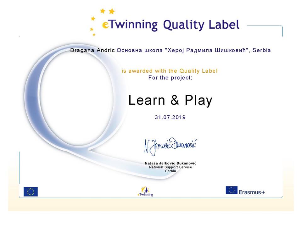 Međunarodni eTwinning projekat „LEARN & PLAY“ u kojem su u protekloj školskoj godini učestvovali učenici 3/2 razreda sa svojom nastavnicom engleskog jezika Draganom Andrić, upravo je dobio Nacionalnu oznaku kvaliteta, koja je najviše priznanje za nivo postignuća i ostvarenost ciljeva projekta na državnom nivou. Oznakom kvaliteta nagrađeni su i sami učenici koji su aktivno učestvovali u radu u učionici ali i na onlajn portalu.