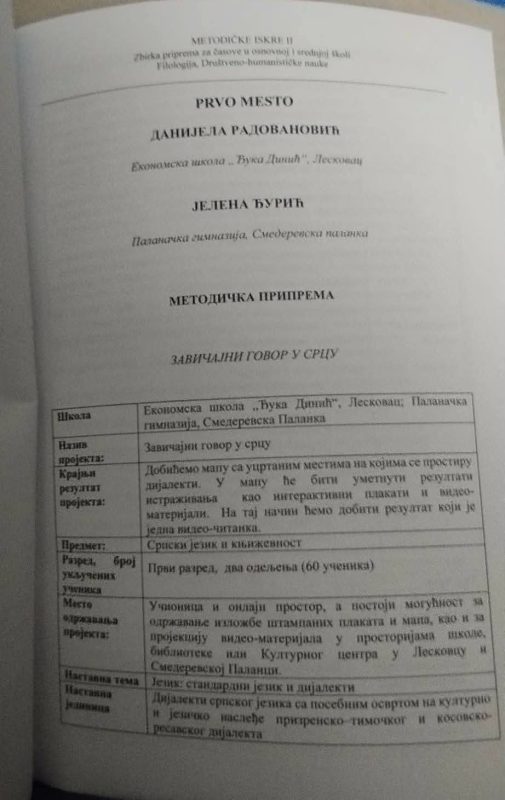 Prvu republičku nagradu za najbolju metodičku pripremu u kategoriji priprema za srednje škole osvojio je koautorski rad Zavičajni govor u srcu-republička nagrada nastavnici Palanačke gimnazije Jeleni Đurić Radovanović. Priprema se odnosi na nastavnu jedinicu ,,Dijalekti srpskog jezika sa posebnim osvrtom na kulturno i jezičko nasleđe prizrensko–timočkog i kosovsko-resavskog dijalekta”.